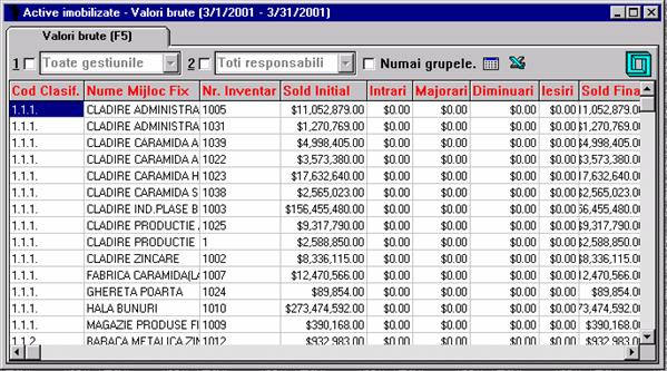 Acest raport prezinta lista tuturor mijloacelor fixe indiferent de gestiune, responsabil, stare. Raportul cuprinde:
