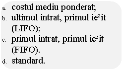 n Standard cost (inregistrarea iesirilor la un cost standard, prestabilit).