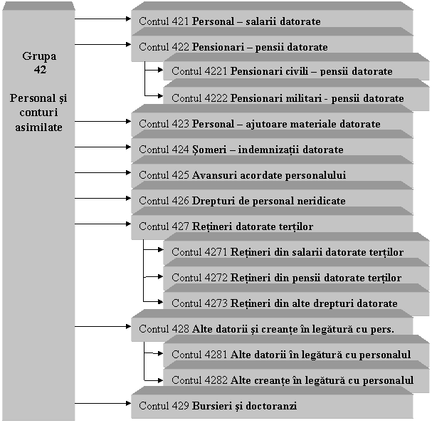 Contabilizarea operatiilor legate de personal si asimilate se asigura cu ajutorul conturilor din grupa 42 - "Personal si conturi asimilate", dupa cum urmeaza[13]: