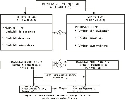 Rezultatul economico-financiar a acestui interval de timp, concretizat īn profit, daca veniturile sunt mai mari decāt cheltuielile, sau īn pierdere, īn caz invers, este denumit uzual "REZULTATUL EXERCIŢIULUI". Desigur, teoretic si practic, rezultatul exercitiului poate fi si este calculat figurānd īn bilantul contabil de la momentul"t", dar numai ca rezultat (suma) global, fara a furniza nici o informatie despre structurile de venituri si cheltuieli care īl genereaza. Pentru a se obtine informatii cu privire la modul de formare a rezultatului exercitiului, dubla reprezentare a cunoscut o "mutatie", de la resursele economice controlate de īntreprindere, si asupra rezultatului economico-financiar. Ca instrument (mijloc) tehnic de realizare a acestui scop contabilitatea a creat "Contul de profit si pierderi", a carui forma virtuala este tot litera "T". Īn partea stānga a contului de profit si pierderi sunt prezentate sistematizat cheltuielile si poarta denumirea de "CHELTUIELI", iar īn partea dreapta veniturile si poarta denumirea de "VENITURI". Īn esenta sa Contul de profit si pierderi este un "tablou" dinamic care prezinta marimea si structura veniturilor si cheltuielilor īn intevalul (t0, t1)asa cum rezulta din fig. nr: 2.3: