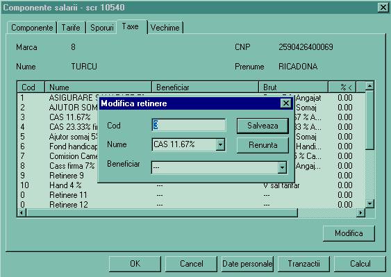 Modificare / Stergere taxa: se selecteaza taxa astfel incat sa se deschida fereastra de Modificare retinere (vezi figura nr. 7) si se introduce 0 la codul taxei.