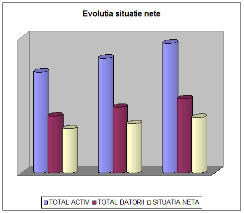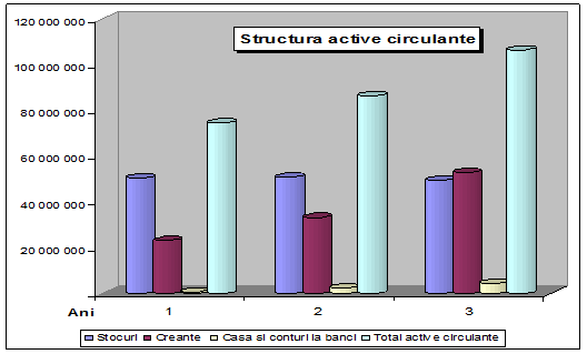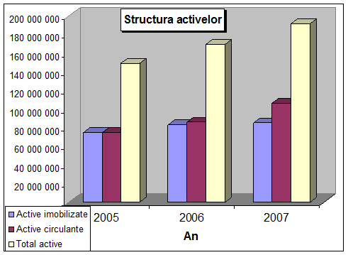 Evolutia structurii activului societatii, indica o evolutie echilibrata a raportului intre activele imobilizate si cele circulante.Daca in 2005, raportul era practic 50% / 50% intre activele imobilizate si cele circulante, in anul urmator raportul devine 49 / 51.Nici in anul 2007, nu se remarca o tendinta de dezeechilibru al acestui raport, activelor imobilate revenindu-le 44% din activ iar celor circulante restul de 56%.