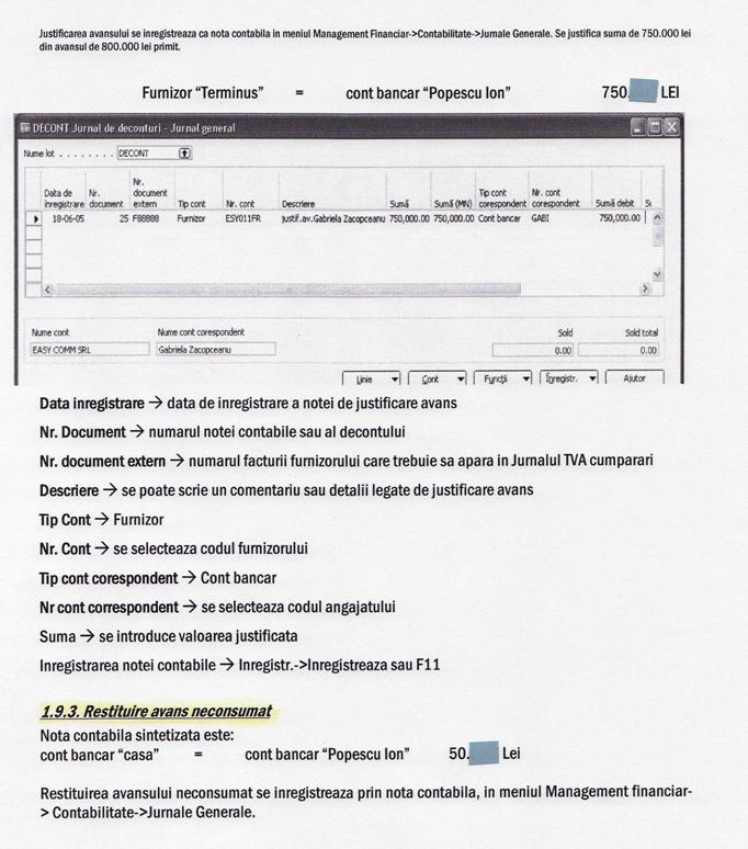 Controlul intern al decontarilor cu personalul revine in sarcina compartimentului de Audit Intern, care periodic verifica ce debite au salariatii in raport cu compania, ce sume primite drept avans spre decontare nu s-au decontat inca.