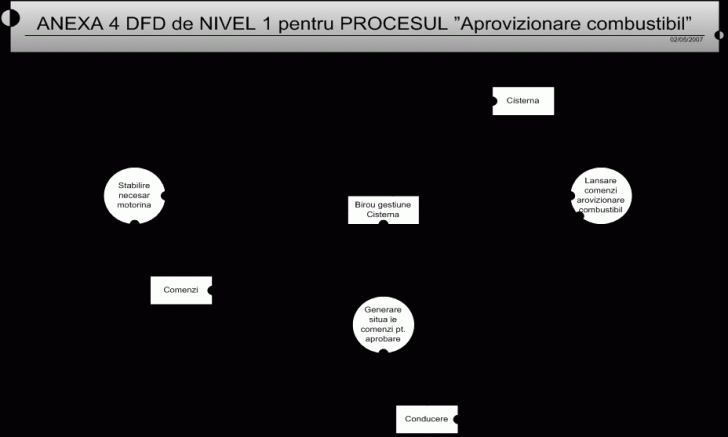 Gestionarul pompei de motorina constata nivelul scazut al motorinei, pompa prevazuta cu un ceas de nivel combustibil. Lanseaza comanda de aprovizionare cu motorina la furnizor, prin telefon,fax, sau email. Furnizorul trimite prin fax, telefon ,sau email oferta pre ului de motorina/litru in perioada ceruta. Gestionarul intocme te un referat cu cantitatea necesara i oferta pre motorina/litru, care il trimite spre aprobare la directorul general la Sibiu, prin fax.