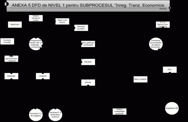 Diagrama de context este prezentata in Anexa 2, diagrama de nivel 0 este prezentata in Anexa 3. Descompunerea proceselor de prelucrare in subprocese este prezentata in DFD de nivel 1 Anexa 4 i 5, a subproceselor in module prin DFD de nivel 2 Anexa 6.