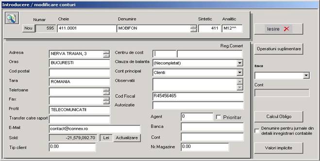 Daca se defineste un cont de terti (client, furnizor, furnizor de imobilizari, debitori/creditori diversi, avansuri spre decontare etc) trebuiesc completate si campurile suplimentare: adresa, cod postal, telefoane, profil, e-mail, cod fiscal care apar tot in acest ecran principal. De asemenea, pentru clienti si eventual si pentru furnizori trebuie completate si campurile de contul si banca partenerului. Aceste informatii se introduc in sistem in alte ecrane suplimentare astfel: