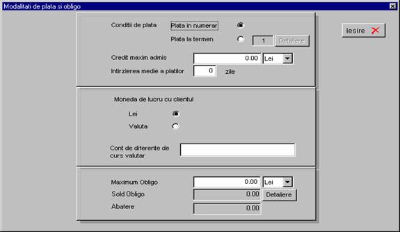 Moneda in care se lucreaza cu clientul (lei/valuta). In acest ultim caz trebuie specificat si contul de diferente de curs valutar, care se completeaza tot in fereastra Modalitati de plata si Obligo prezentata anterior.