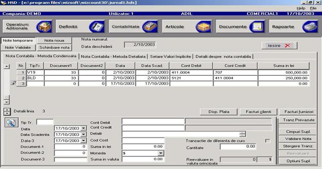 Sumele si conturile. Prin modul de vizualizare a conturilor si implicit a sumelor se deosebesc cele doua metode de vizualizare. Astfel in metoda condensata sunt aratate conturile principale asa cum au fost definite in tipurile de tranzactii sau primele conturi introduse atat pe debit cat si pe credit impreuna cu suma in lei si/sau valuta care reprezinta totalul tranzactiei :