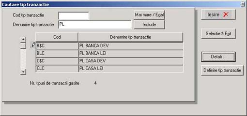 Selectand un tip de tranzactie putem vedea tipul de tranzactie detaliat apasind butonul Detalii. . Putem defini tipuri noi de tranzactii apasind butonul Definire tip tranzactie. Dupa ce am gasit tipul de tranzactie pentru a reveni in fereastra precedenta folosim butonul Selectie & Exit.