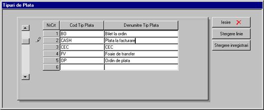 Tipul de plata se refera la tranzactiile care vin din gestiune aratind pentru facturile de vinzare modalitatile de plata. Pentru cautarea modalitatii de plata printre modalitatile definite se foloseste tasta F7 cind apare urmatoarea fereastra :