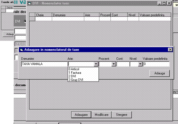 Adaugare : Permite alegerea unei taxe din nomenclator ca fiind aplicabila la nivelul curent (Grup DVI, DVI, Factura externa, Articol)