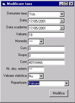 Modificare :are ca efect afisarea unui ecran in care se pot modifica parametrii de aplicare a tipului de taxa selectat din nomenclator.