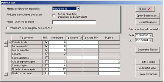In acest ecran se vor defini setari referitoare la rotunjirea sumelor pe documente, formatele tipizate pentru facturi si alte documente, numerotarea acestora si alte setari legate de gestiune.