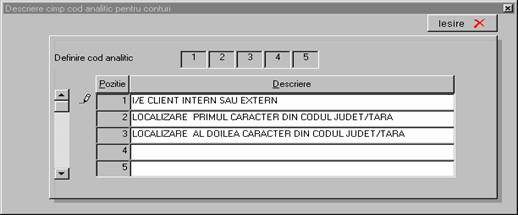 In fisele conturilor si ale articolui exista un camp cu numele analitic (filtru). Acest camp face posibil selectarea de diversele grupuri care nu sunt consecutive in timpul emiterii rapoartelor. In fiecare caracter se poate nota o litera sau o cifra oarecare. Fiecare caracter poate sa specifice o anumita caracteristica a fisei contului. In ecranul care urmeaza definim pentru fiecare caracter caracteristica pe care o reprezinta. Datele din fereastra definitiei codului analitic nu apar in rapoarte si folosesc doar ca "unelte" ajutatoare utilizatorului.