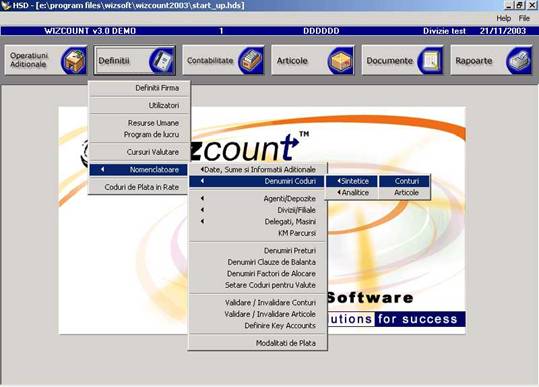 Meniul "Definitii" cuprinde setari generale pentru intreaga companie si nomenclatoarele folosite in contabilitate si gestiune.