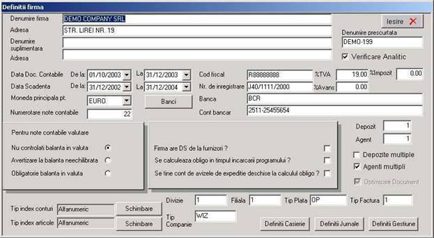 Denumire firma: Campul trebuie completat corect si complet cu datele de identificare ale firmei, deoarece acestea vor fi tiparite pe documentele si rapoartele emise din companie.