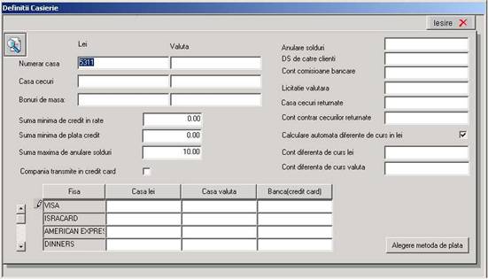 In acest ecran se definesc datele referitoare la evidenta numerarului, respectiv se stabileste legatura intre casa si contabilitatea conturilor. Unele dintre campuri (in special cele legate de card-uri) se completeaza pentru firmele care au atasate dispozitive de citire pentru aceste suproturi sau imprimanta fiscala.
