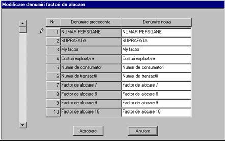 In acest tabel sunt 6 factori de alocare definiti: numar persoane, suprafata, my factor (un factor cu semnificatie personala), costuri de exploatare, numar de consumatori, numar de tranzactii. Factorii suplimentari pot fi redefiniti.