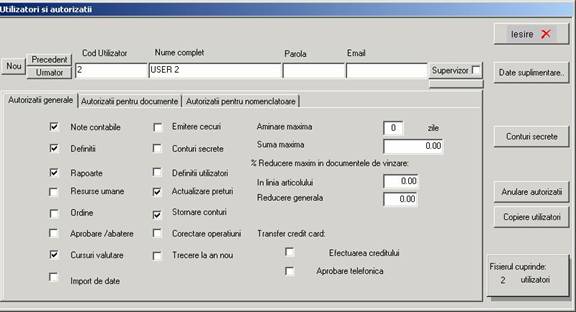 Fiecarui utilizator i se pot seta o parola si autorizatii pentru vizualizare, modificare sau stergere (pe documente, in nomenclatoare sau pentru alte operatii).