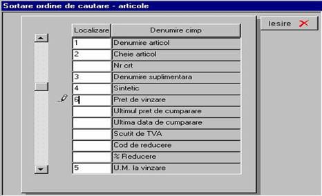 Creionul din stanga tabelului indica linia curenta (oriunde am da click in interiorul acesteia). Pentru a alege unul din articole apasam butonul "Selectie&Exit" (Alt+X), daca nu am gasit ce trebuia putem alege alta selectie sau sa abandonez utilizand butonul "Iesire".