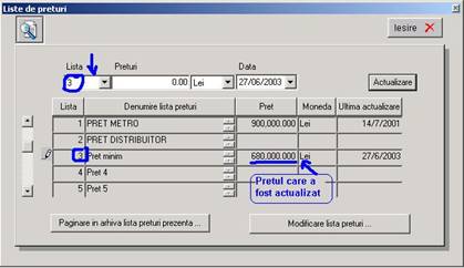 Pasul 4) Se apasa butonul Actualizare, iar pretul si data actualizata vor aparea in tabel in dreptul listei respective.