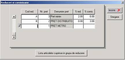 Cod reducere: Precizeaza o grupare de articole ce vor fi vandute cu acelasi pret de lista unui client (eventual cu alt pret de lista altor clienti). Vezi capitolul 5.2 Preturi