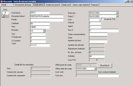 Date, Sume si Informatii Suplimentare: Pentru fiecare articol pot fi memorate diverse informatii (observatii textuale), date (semnificative pentru anumite operatii cu articolul respectiv, de exemplu date ale unor contracte, etc.) sau sume (care pot fi actualizate manual sau prin emiterea unui raport de Vanzari pe articole in care se specifica ce suma se va actualiza in fisa fiecarui articol de pe raport cu sumele nete de pe raport).