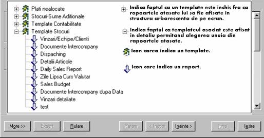 Alegand optiunea Modificare/rulare raport existent template-urile urmeaza a fi detaliate (in stanga celor care contin rapoarte va aparea un +, ca la directoarele din Windows Explorer). Dand clic pe + sau dublu click pe denumirea template-ului se va deschide lista rapoartele existente (salvate in generator in acel template). Fiecare raport are in stanga semnul sageata in jos.