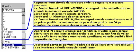 3) Se alege un operator potrivit (relationali: =,<>(diferit),>,>=,<,<=, IN("valoarea se afla in multimea"), BETWEEN ("intre", "in intervalul"), LIKE ("arata ca", sablon).
