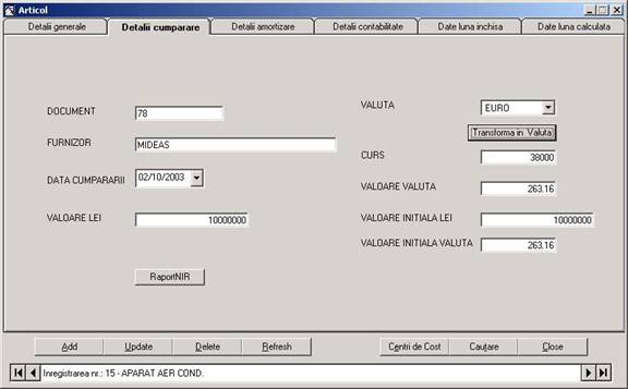 In tab-ul Detalii cumparare se completeaza Document, Furnizor, Valoare lei, Data Cumpararii (eventual campurile pentru valuta)
