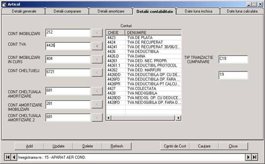 Se apasa Add, se cauta articolul, numarul de document este numeric, valoarea ramasa de amortizat ( oricum programul calculeaza valoarea ramasa). Inregistrarea la iesire in contabilitate se face prin contul 672. Daca este alta inregistrare , aceasta se va sterge din nota contabila deschisa din Wiz si se face manual in nota contabila inegistrarea corecta. Pentru salvare se apasa Update.