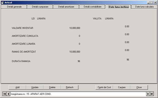 Urmatoarele doua ferestre sunt doar ferestre de afisare a datelor referitoare la situatia mijlocului fix. In fereastra Date luna inchisa sunt prezentate sumele calculate anterior si validate, in timp ce in fereastra Date luna calculata se tine cont de calculul amortizarii mijlocului fix fara ca aceste date sa fie validate (definitive).