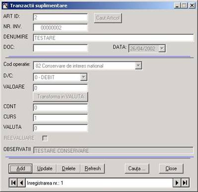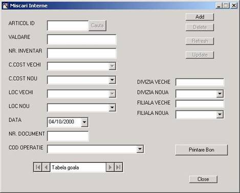 Se apasa butonul Add . Se cauta articolul, si se dau vechile si noile date, precum si data miscarii. Numarul de document este numeric. Se alege codul operatiei din lista. Pentru salvare se da Update.