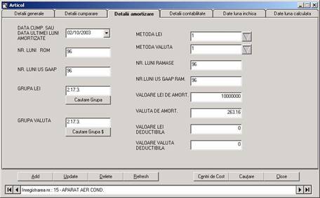 Se da metoda de amortizare ( nu trebuie sa ramana de la 1 la 4). Se pot selecta articolele dupa numar de inventar, grupa,centru de cost, localizare, cod operatie.