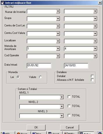 Se pot realiza selectii in functie de numarul de inventar, grupa, centru de cost, localizare, metoda de amortizare ( ex. Dela 1 la 1), codul operatiei, si perioada intrarii.