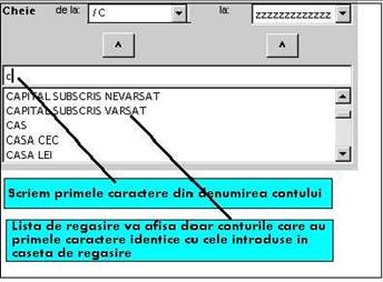 Putem sti cu ce incepe cheia de cont si atunci vom tasta in campul Cheie de la: caracterul ? urmat de primele caractere din cheie si apasam Enter. In tabelul de dedesubt vor aparea toate conturile ale caror chei incep cu selectia facuta. Aceasta metoda e un alt mod de cautare in locul tastei F7.