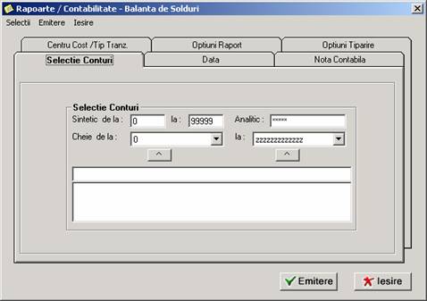De exemplu pentru a rula un raport pentru toate cheile de cont din companie, implicit vor fi selectate toate conturile, dar ele pot fi limitate dupa codurile lor sintetice, codurile lor analitice 757c23h sau dupa cheile lor de cont. Introduceti datele conform urmatoarelor exemple: