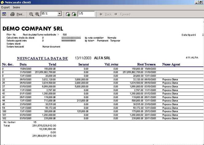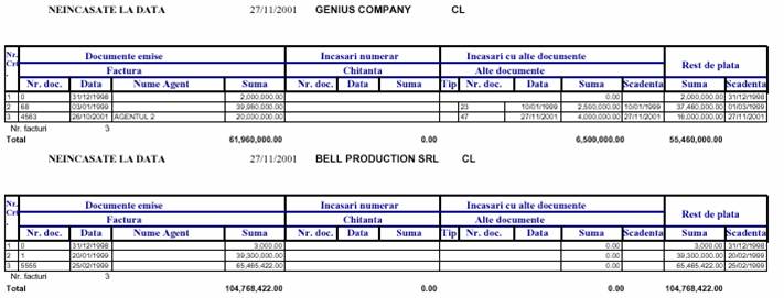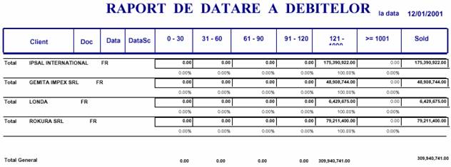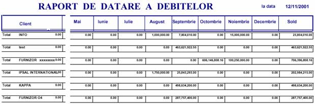 Daca selectia la data nu este de la 01/01/1980 si se realizeaza pe o perioada mai mica exemplu de la 01/11/2001 la 14/11/2001 rezultatul nu va fi o balanta de solduri ci o balanta in care sunt listate diferentele dintre facturi si plati tinand cont de documentele care au data in acest interval de timp.