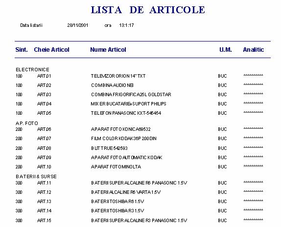 Raportul emis cu selectarea optiunii Articole/ Depozite arata astfel: