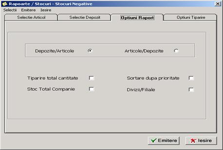 Fereastra de selectie arata similar cu cea a raportului precedent cu deosebirea ca apare o optiune noua Stoc Total Companie care poate fi bifata in cazul in care se doreste afisarea doar a articolelor care au stoc negativ la nivel de companie.