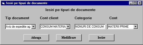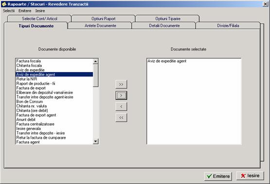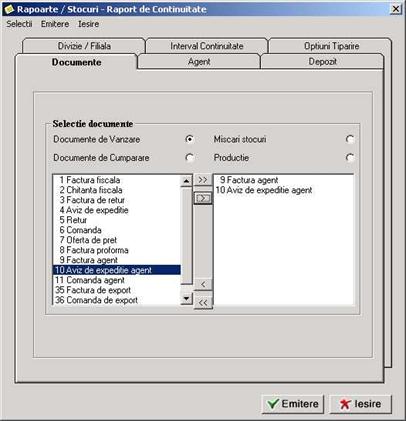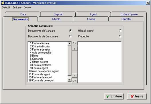 In tab-ul Documente se selecteaza: Tipul de document (de vanzare sau de cumparare, miscari stocuri sau productie) si Denumirea documentelor dorite (se aleg din lista).