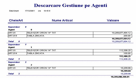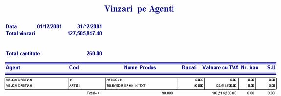 Daca alegeti butonul AGENT urmeaza afisarea unui raport pentru fiecare agent de vanzari: