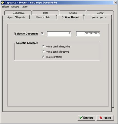 Raportul de vanzari pe documente afiseaza datele putin diferit fata de raportul precedent si in plus se pot realiza selectii si in functie de numarul de document.