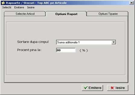 Criteriul de obtinere a top-ului va lua in calcul una din sumele aditionale actualizate anterior printr-un raport de Vanzari pe Articole pe articolele respective. Se alege un procent pana la care sa se incadreze totalul acestor sume: