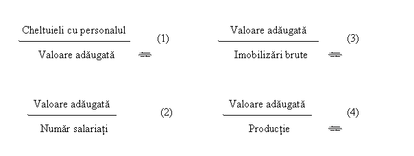 Primul raport indică ponderea din valoarea adăugată distribuită salariaților, al doilea arată nivelul productivității/salariat, iar al treilea nivelul productivității unei unități de capital (imobilizări) folosite în exploatare. În condițiile în care rezultatul raportului prezentat în relația (1) este mare, rezultatul raportului din relația (2) este redus, se poate afirma că managementul întreprinderii se confruntă cu o problemă privind remunerarea factorilor de producție. Astfel, are loc un transfer de valoare de la factorul de producție capital către factorul de producție muncă, alterând capacitatea întreprinderii de a reînnoi și dezvolta dotările sale materiale.