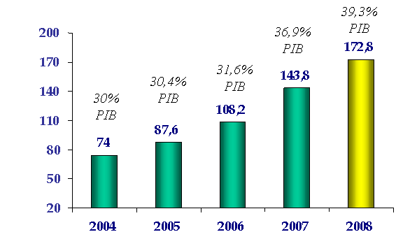 Veniturile din contributiile de asigurari sociale continua sa detina ponderea cea mai mare în produsul intern brut, înregistrând o crestere de 1,4 puncte procentuale (de la 9,5% în anul 2007, la 10,9% în anul 2008).