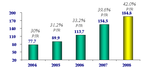 Transferurile continua sa detina ponderea cea mai mare în produsul intern brut (18,5% din P.I.B.), cu 1,7 puncte procentuale în crestere fata de anul 2007 în conditiile cresterii reale a pensiilor.