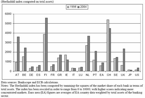 Un numar īnsumat de tari europene au un nivel īnalt al concentrarii bancare, notabil īn Austria, Belgia, Finlanda, Olanda, Elvetia. Aceasta situatie nu se compara cu cea din Germania, Franta, Italia, Spania, Luxemburg ca si cea din Japonia si SUA unde concentrarea interna este mai limitata sau nu are aceleasi efecte.