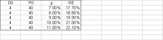 Exemplu: ultimul dividend platit de compania A a fost de 5. Actiunile firmei se vand cu 40 iar rata de crestere a dividendului este de 7%.