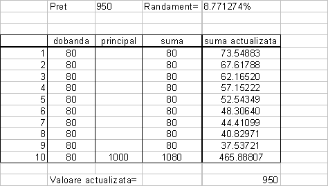 Exemplu: o firma emite obligatiuni pe 10 ani, dobanda 8%. Pretul unui obligatiuni este in prezent 950.